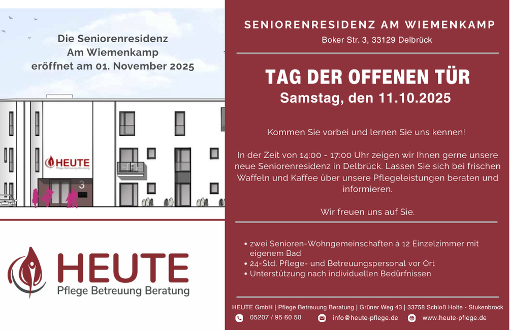 Am 07.10.2024 sind die Bauarbeiten auf dem Grundstück an der Boker Str. 3 in 33129 Delbrück gestartet. Auf dem 1250 m² großen Grundstück entsteht die Seniorenresidenz Am Wiemenkamp mit zwei Senioren-Wohngemeinschaften à 12 Einzelzimmer und einem Staffelgeschoss mit fünf (Betreuten) Wohnungen. Die beiden Wohngemeinschaften befinden sich im Erdgeschoss und im 1. Obergeschoss. Jedes großzügig geschnittene Einzelzimmer verfügt über ein eigenes Badezimmer und einer eigenen Terrasse oder Balkon. Die sehr zentrale Lage der Seniorenresidenz ermöglicht den Bewohnern fußläufig Ärzte, Lebensmittelläden, Friseure etc. aufzusuchen.
